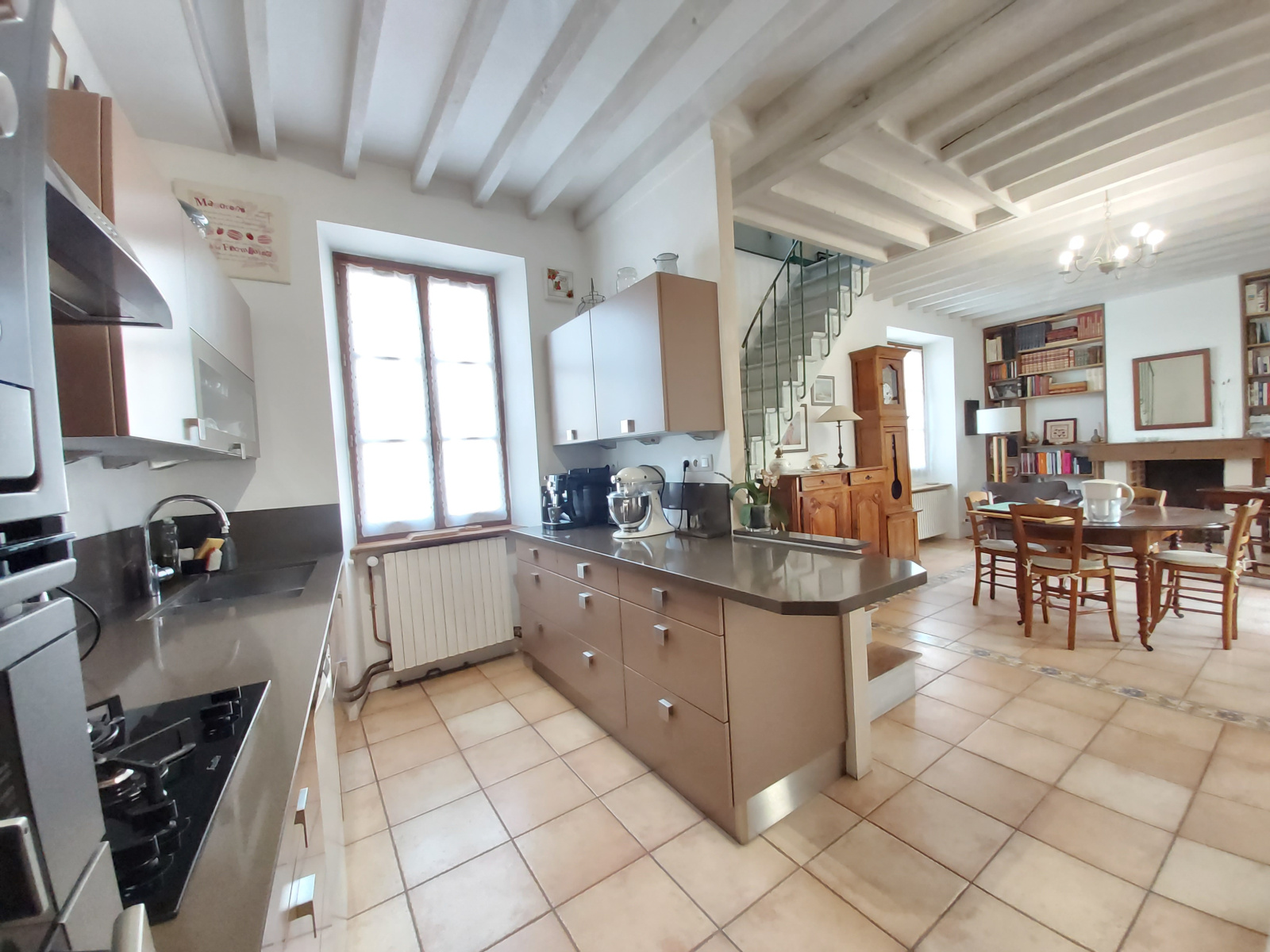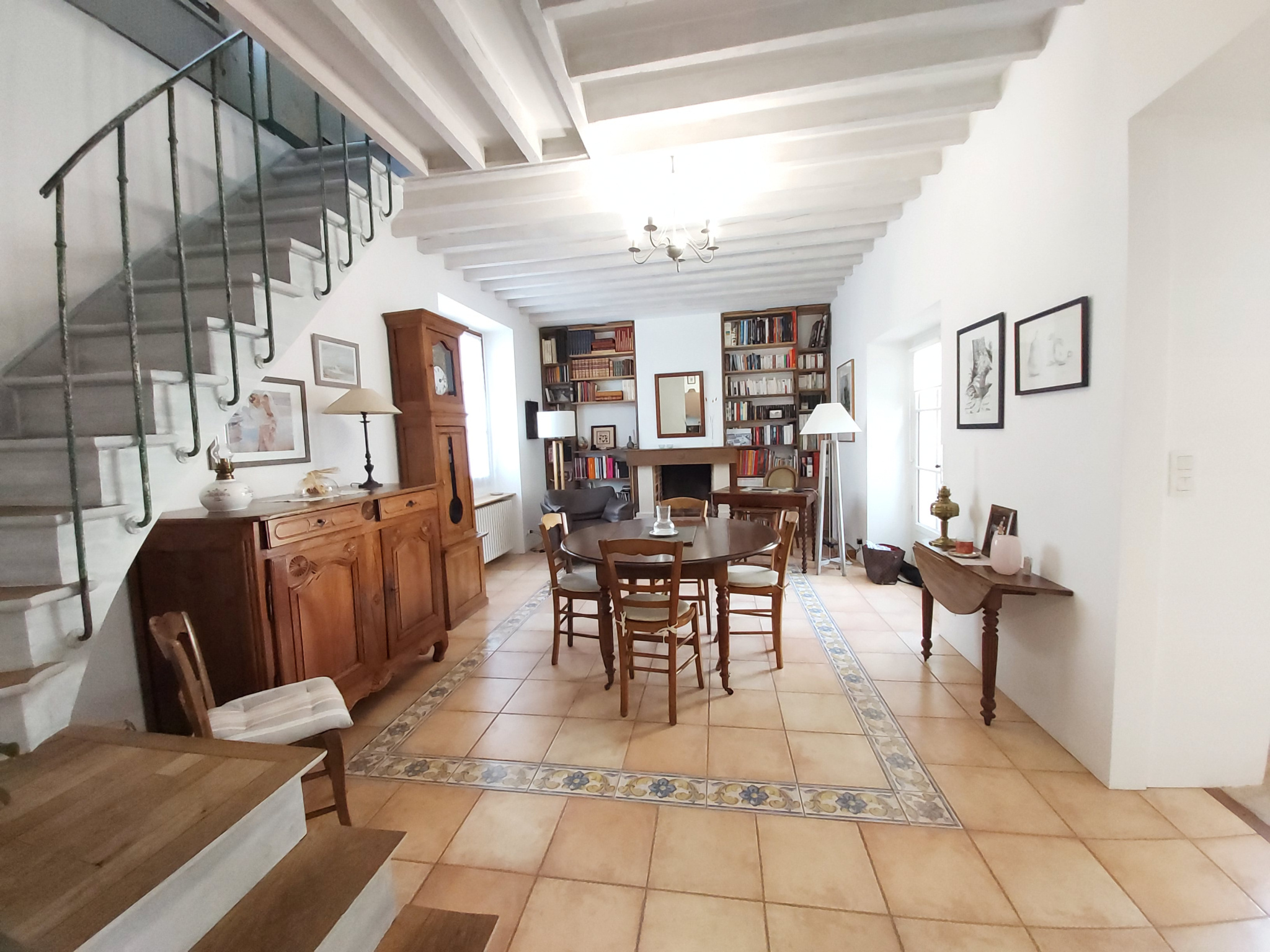 Salle à manger lumineuse disposant d'une jolie cheminée fonctionnelle et entretenue entourée d'une bibliothèque sur mesure. La pièce donne un accès à une cuisine américaine, aménagée et équipée. Un escalier d'époque permet d'accéder aux chambres de l'étage.