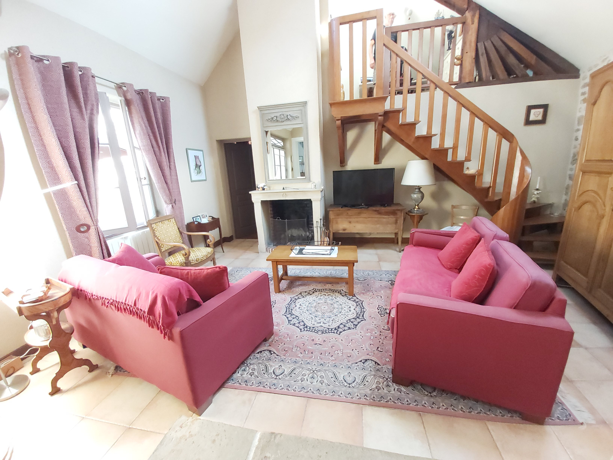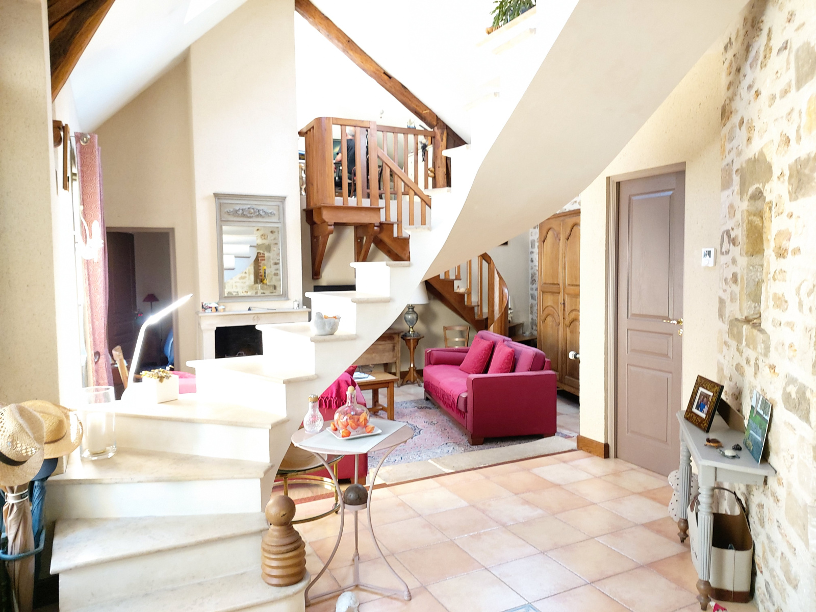 Jolie salon lumineux avec toit cathédrale donnant accès à deux mezzanine et une chambre. Un premier escalier sur mesure et en bois de qualité ainsi qu'un second également sur mesure en béton et marbre. Le salon dispose d'une seconde cheminée fonctionnelle.